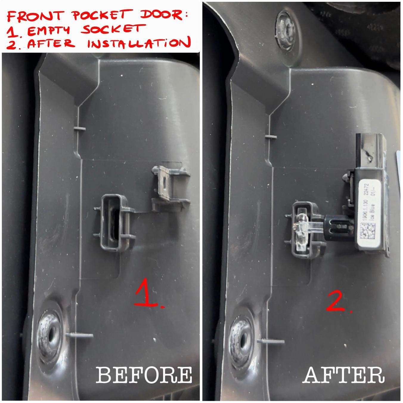 Die vordere Türverkleidung verfügt über die originale Fassung für die Taschenlampen, so dass die Montage problemlos ist. Stecken Sie die Lampe einfach in die Fassung.