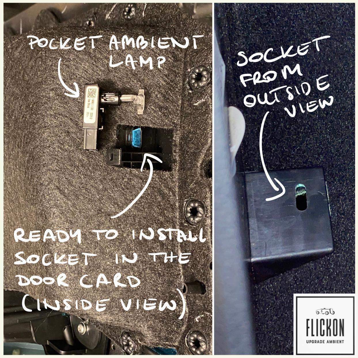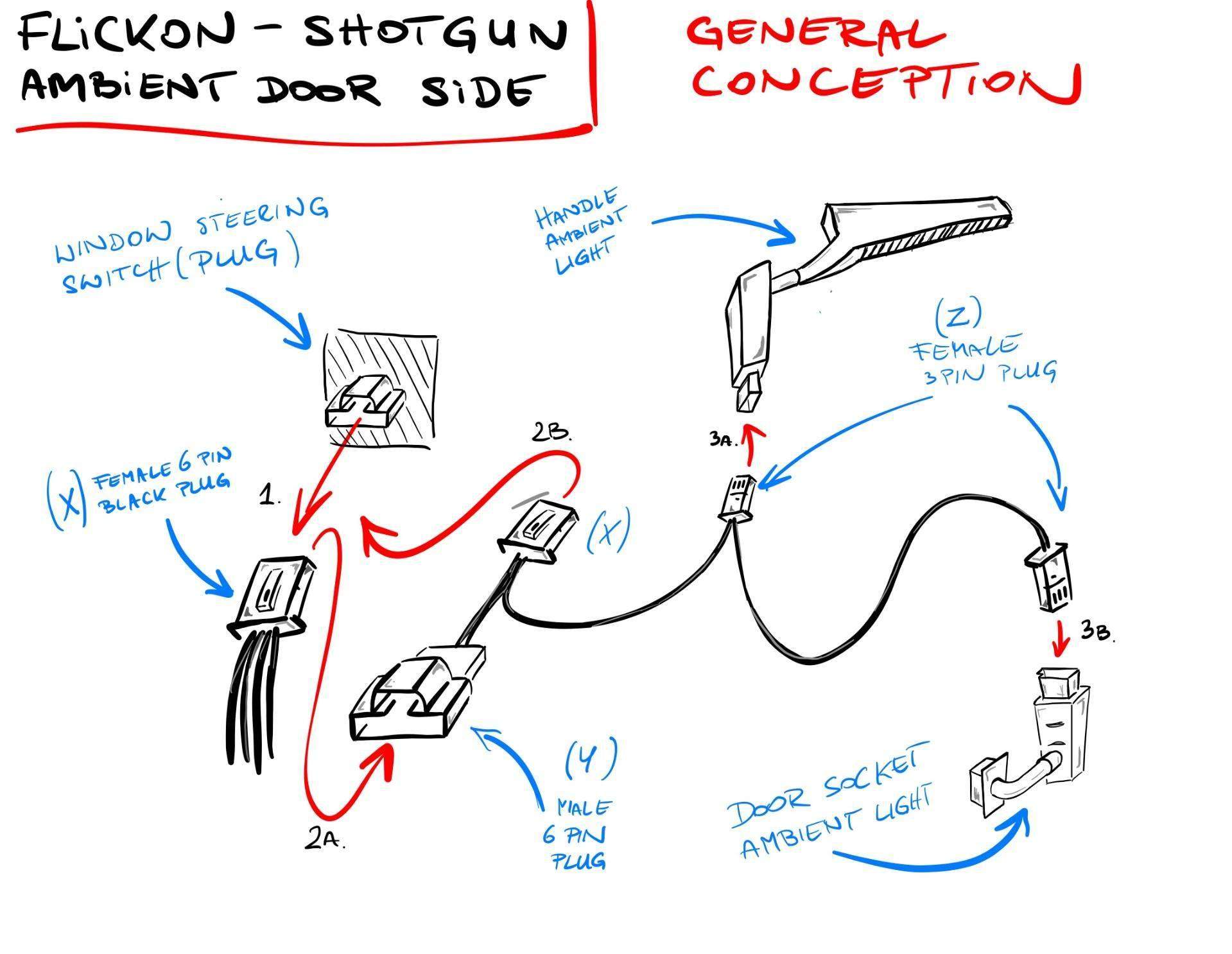 The concept of retrofitting the passanger (shotgun) door handles with ambient lighting is based on a non-invasive extension of the window control button illumination. Just remove the plastic door panel, replace the handle and connect with a dedicated harness. The presented solution allows you to install the wiring necessary to connect the ambient lights to the door handles and the SHOTGUN door pockets using the non-invasive Plug&Play method.