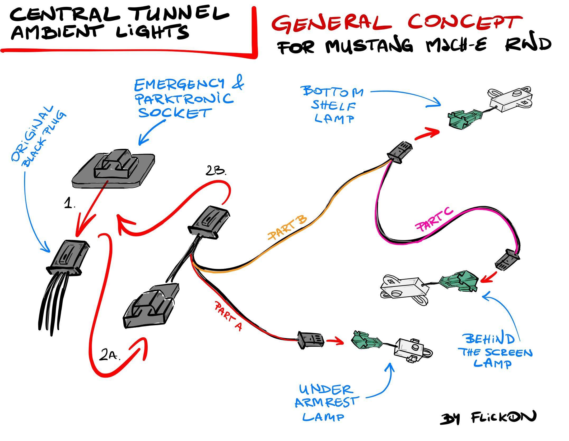 This DIY set was designed for easy and non-ivasive plug&play installation. We are powering the additional lamps using illumination from the parktronic & emergency button. We crafted the harness wire and devide it on 3 parts. Part "A" for connecting the under-armrest lamp, Part "B" for connecting the bottom shelf lamp, and Part "C" for behind the screen lamp. The whole process shouldn't take more than 30 minutes.