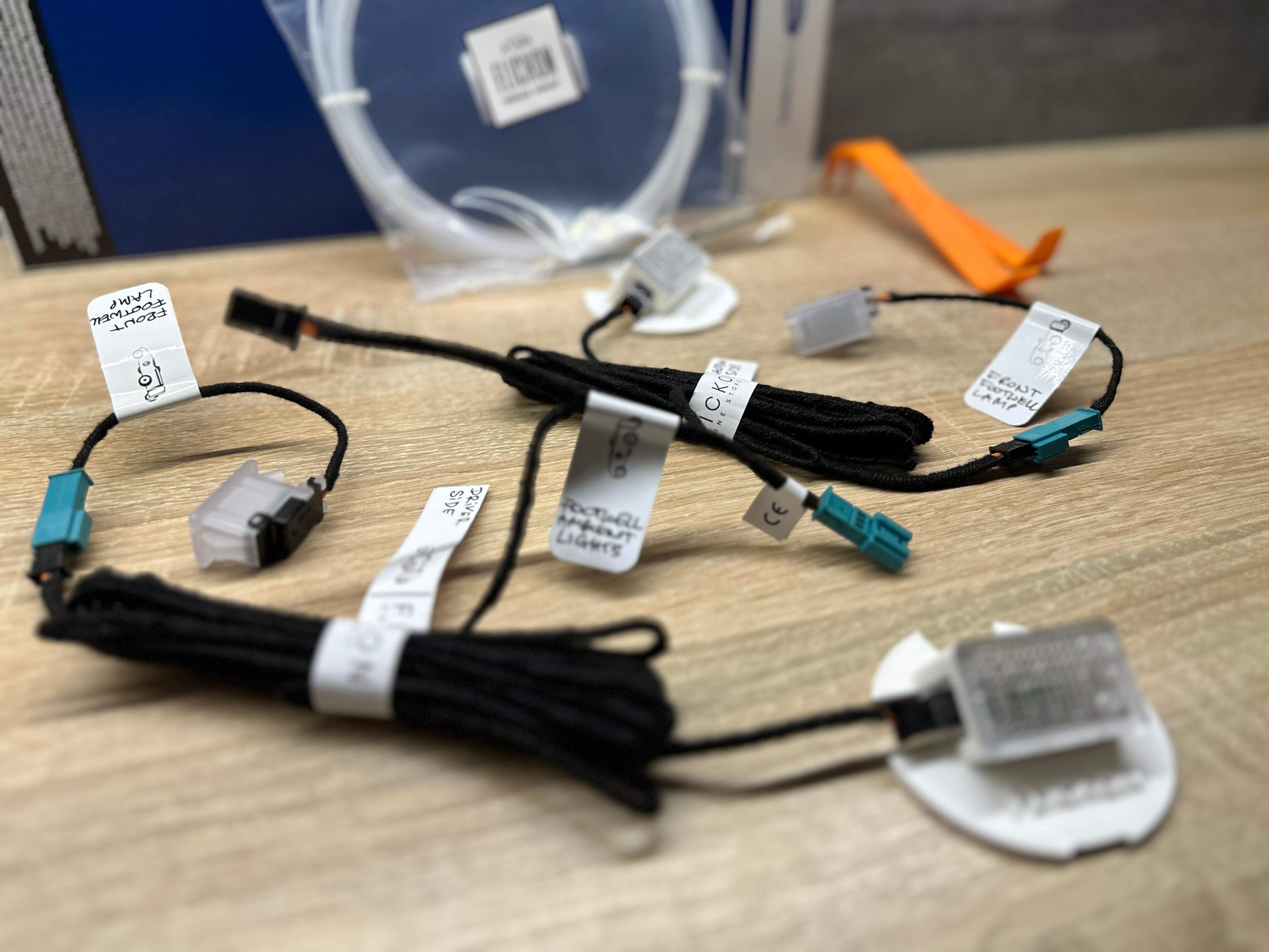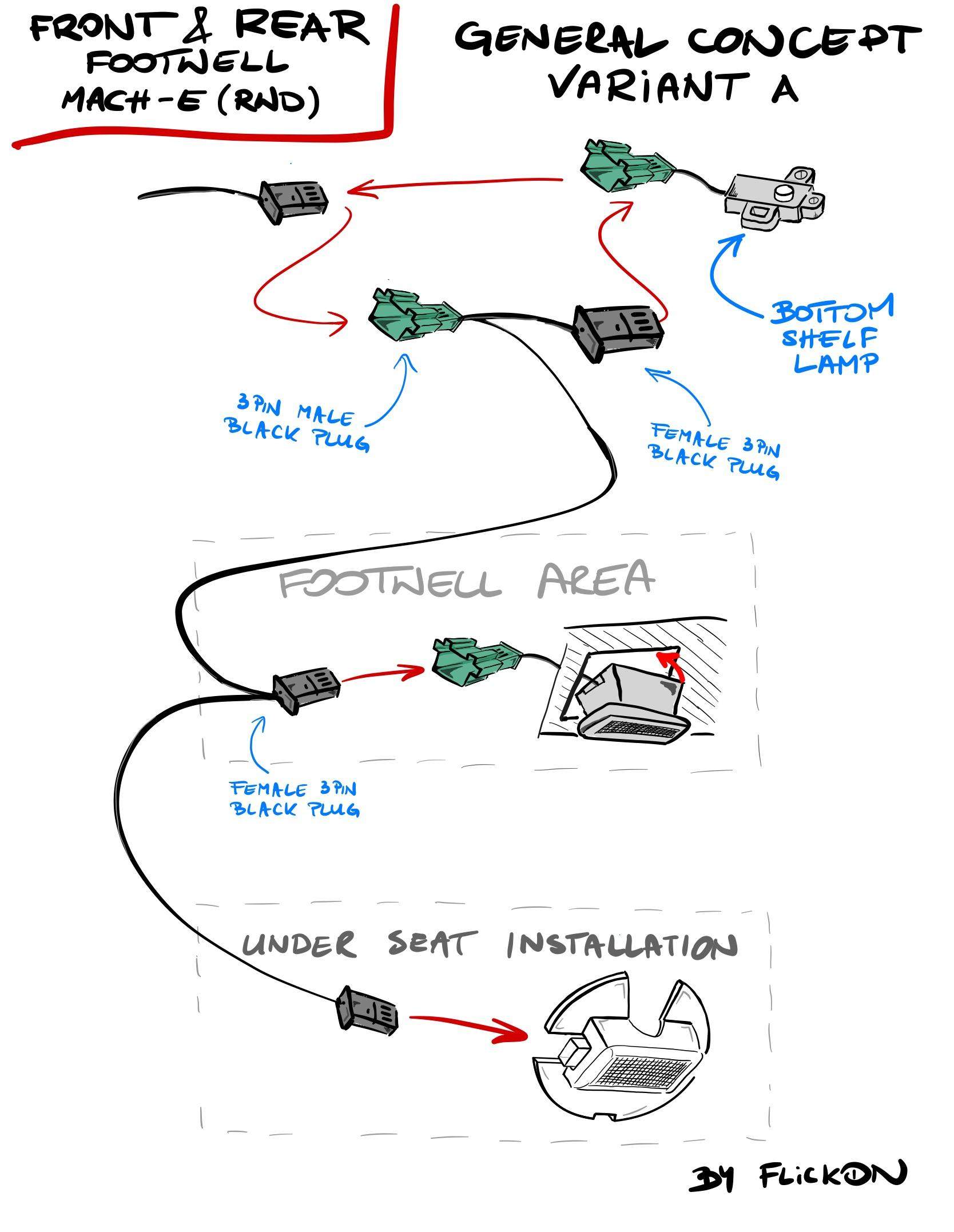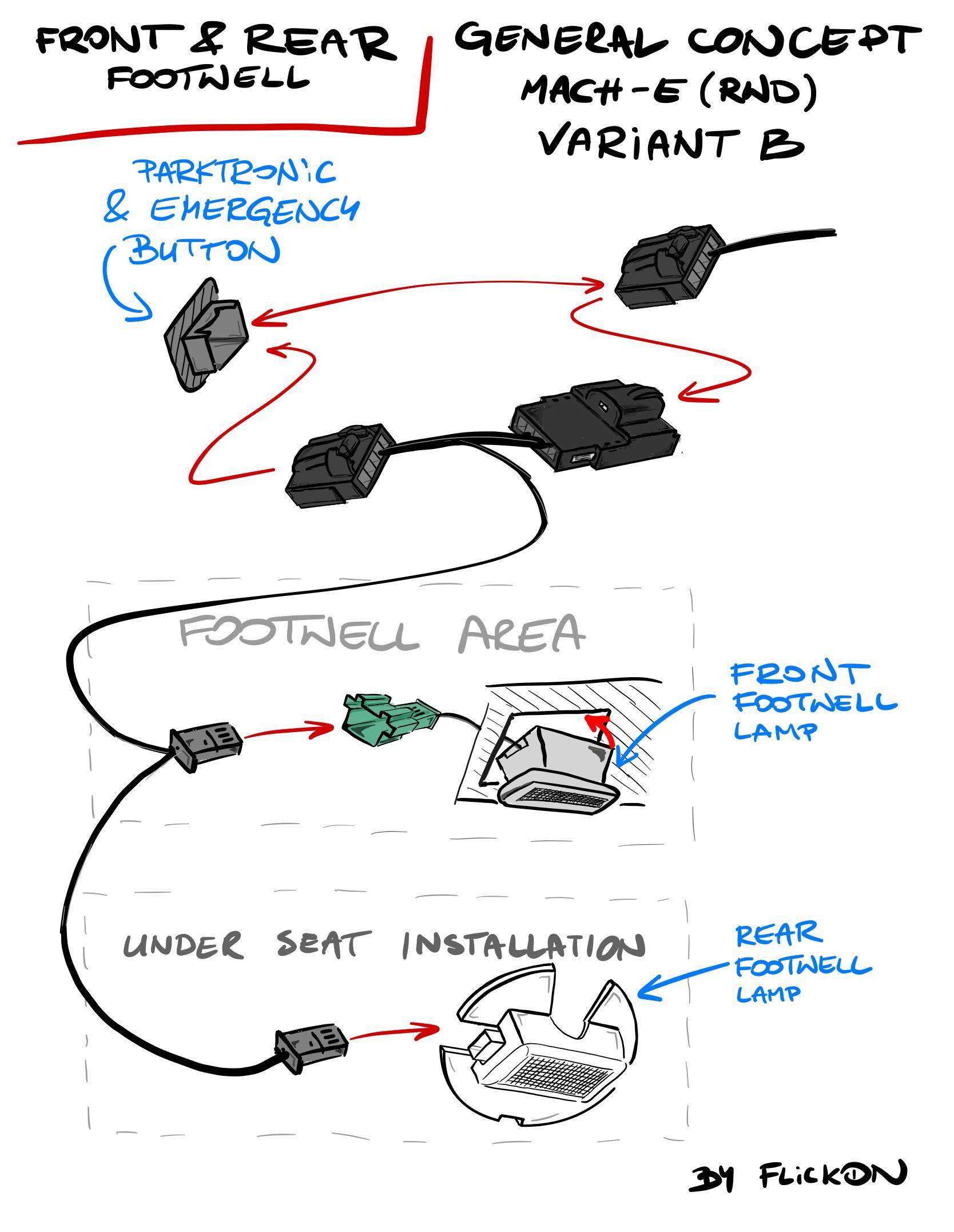 This set combines the FRONT and REAR footwell lighting sets for the Mustang Mach-e RWD. This composition offers one longer harness wire to connect all footwell lamps in the front and rear areas The general concept is below, and for installation details, follow the FRONT or REAR subpages.