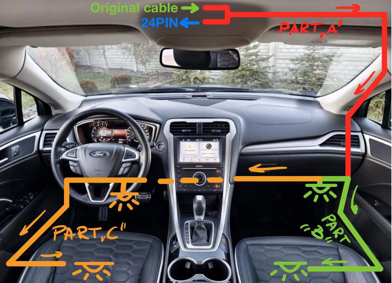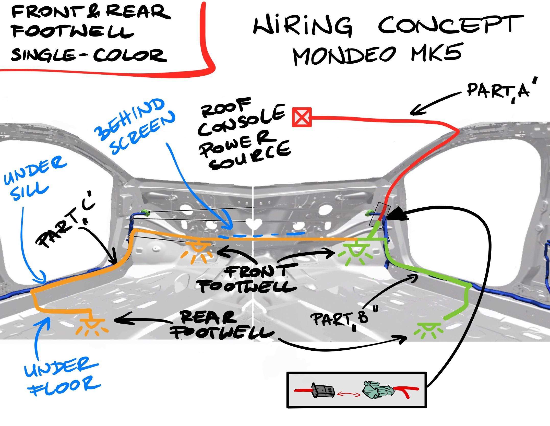 This set combines the FRONT and REAR footwell lighting sets for the Mondeo MK5. The general concept is below, and for installation details, follow the FRONT or REAR subpages.
