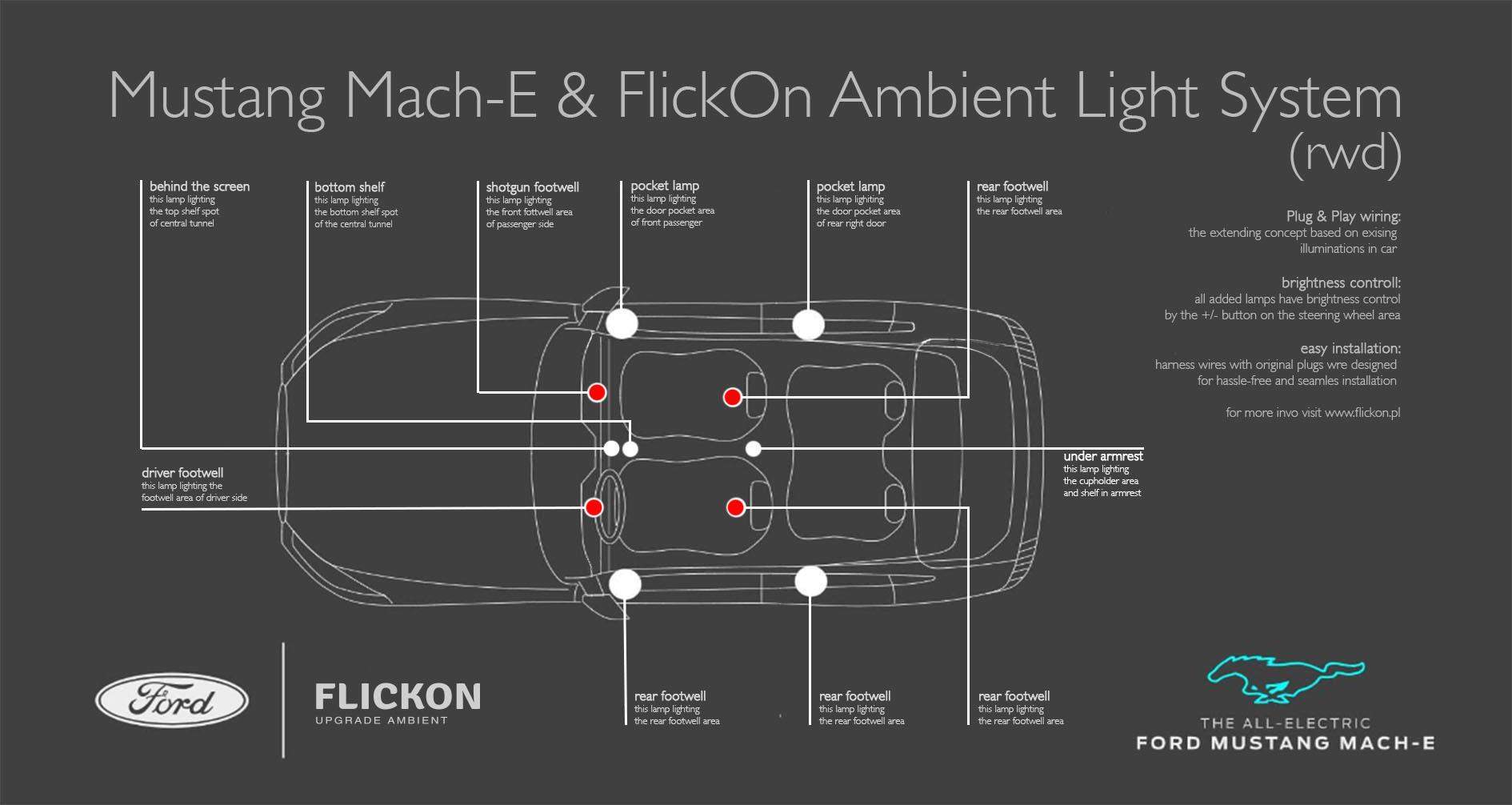 Generally, the all Mach-E with rear wheel drive (RWD) option, doesn't provide any ambient lighting. So, we have decided to fill that gap by offering ice blue sets in footwells, doors, and central tunnel areas. All were designed for plug-and-play, hassle-free installation. Check our proposition for footwell ambient lights.